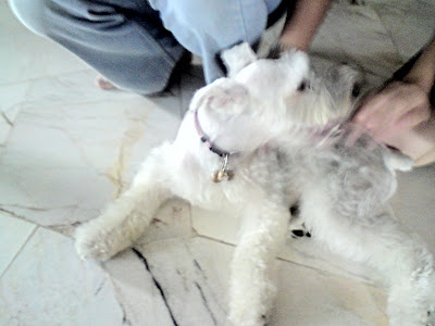 after get our lunch, my dad went to bought "yee sang", roasted duck and some others food to bring to my uncle house for dinner. FYI, my uncle house was located at rawang, stay together wif my granma. We reach rawang around 1500 hours. At the instant i entered the house, i notice a very cute and adoreable schnauzer rare by my uncle. it have been almost half year i din come tats y i dunno he was raring a dog. The dog name was Prince, lol...but he reli cute anbd adoreable! he wasn't scare stranger and kinda like stick wif me.