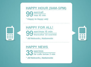 * Say hello to our brand new talktime rates! talk all you wan at just RM0.99 for HAPPY-to-HAPPY calles from 9am-5pm. What's more calls to all networks nationwide also cost RM0.99 for the first 15 minutes and RM0.33 thereafter. Be Happy! *